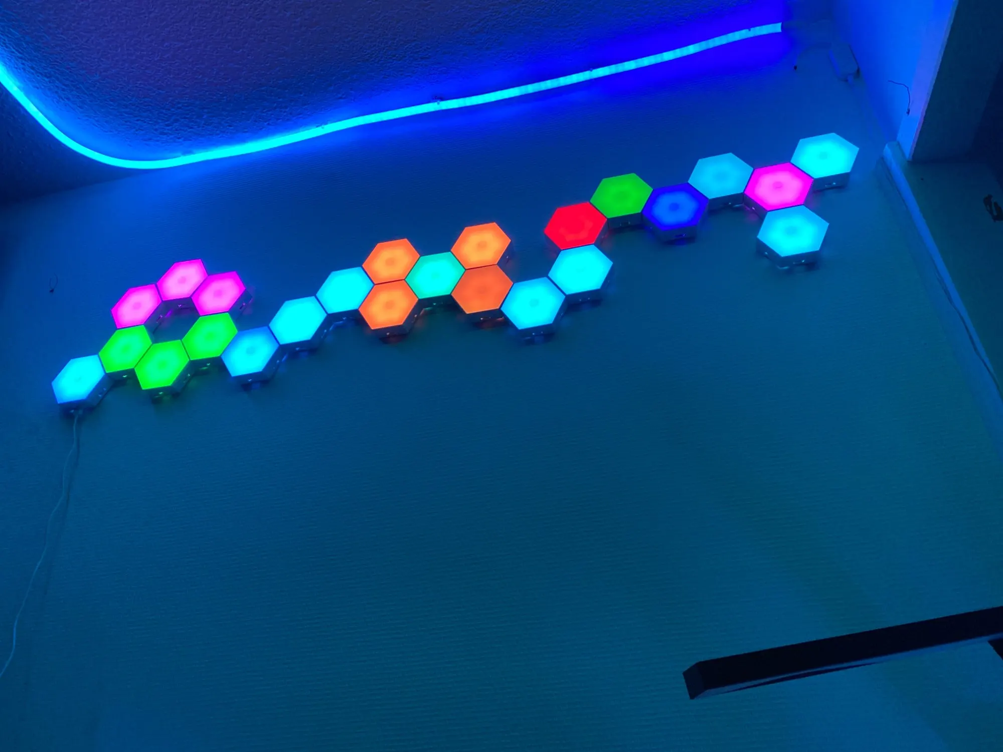 Our Hexagones Modulaires feature a modular design, a touch-sensitive lighting system, a magnetic base structure, and a night light. Transform your living room with these modern hexagon wall decorations designed for easy installation Quantique LED RVB Capteur Tactile LED Veilleuse .